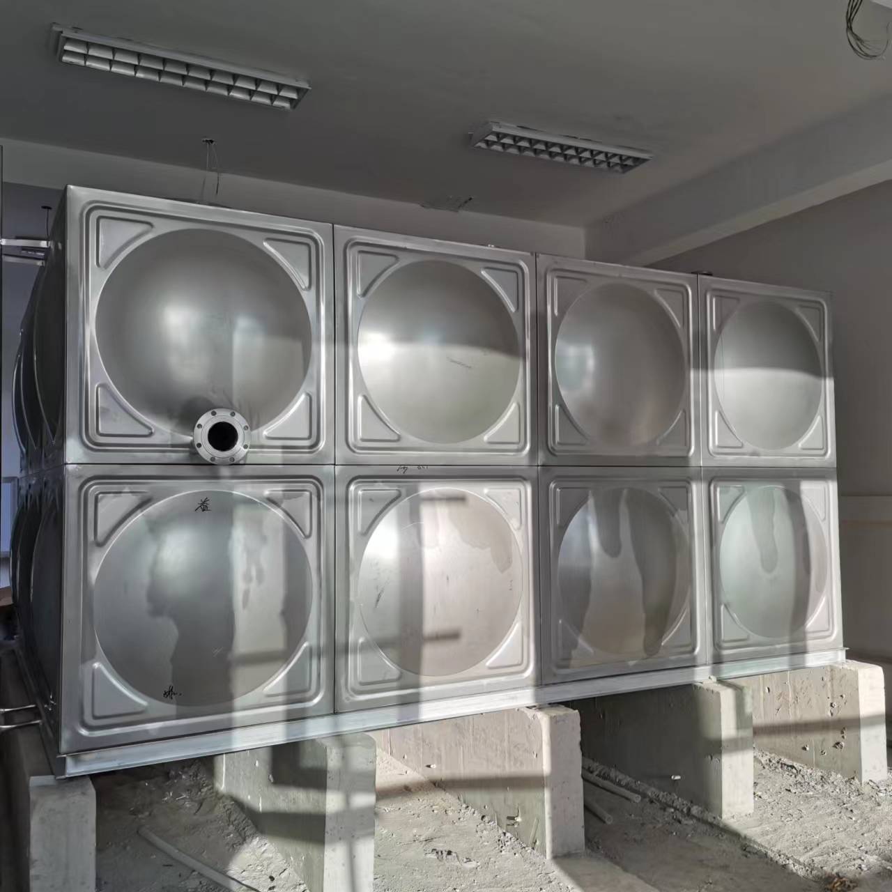 五、易于現場安裝:焊接不銹鋼消防水箱用于抑制植物,現場焊接的方式。因為不銹鋼水箱中使用內部焊接,因此罐可以放置在靠墻,其空間是有限的三個側面對用戶是非常有利的。