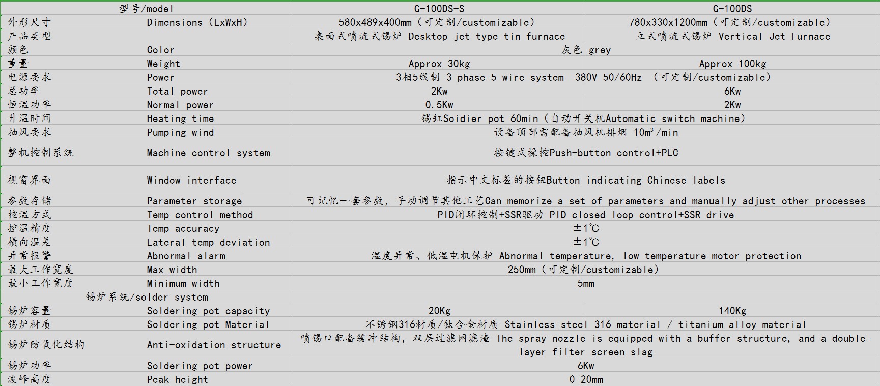 9、錫槽及噴錫通道均采用316不銹鋼或鈦合金制作,耐高溫,耐腐蝕,發熱芯采用進口鎳鉻發熱管,經久耐用;
